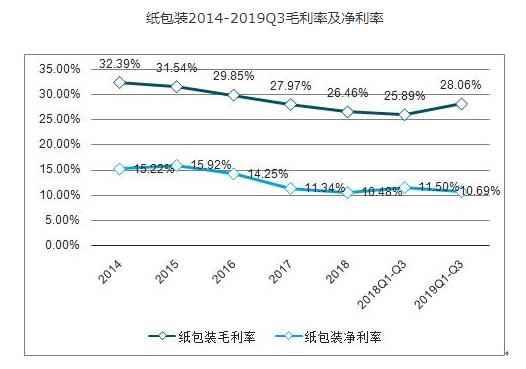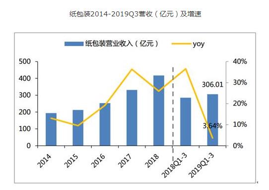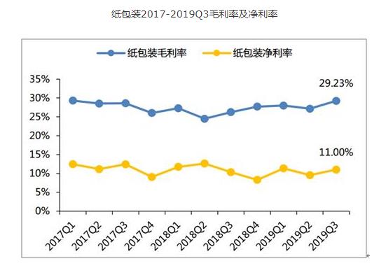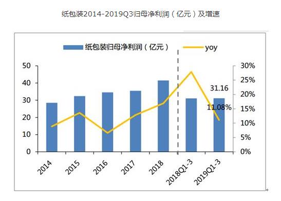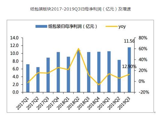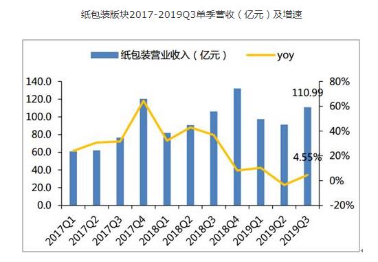 2019Q1-3紙包裝板塊實現營業收入306.01億元,同比+3.64%;實現歸母淨利潤31.16億元,同比+11.08%。