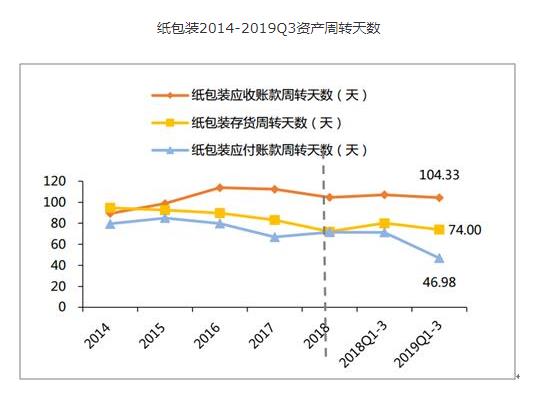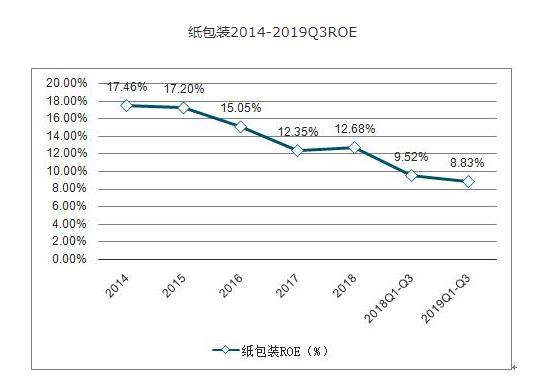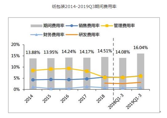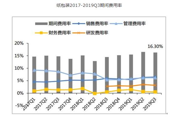 2019Q1-3紙包裝子版塊毛利率同比+2.17pcpts至28.06%,淨利率同比-0.80pcpts至10.69%。期間費用率同比+1.95pcpts至16.04%,其中銷售費用率同比+0.62pcpts至6.06%;管理費用率同比+0.64pcpts至5.99%;財務費用率同比+0.17pcpts至0.84pcpts;研發費用率同比+0.52pcpts至3.14%。