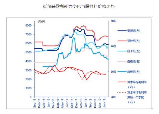 盈利能力改善係:1)原材料價格回落:2018Q2各紙種價格較高,2019Q2各紙種價格明顯同比回落(銅版紙、雙膠紙、白卡紙、白板紙、箱板紙同比下降19%、14%、13%、12%和20%),考慮到原材料庫存周期,2019Q3行業盈利能力有望繼續環比提升。2)行業整合話語權提升:紙包裝行業持續整合,如箱板瓦楞紙龍頭合興包裝訂單量逆勢持續增長,行業整合推動行業盈利水平觸底回升。3)提升價值鏈附加:以紙包裝為載體為品牌商提供高附加值服務,提升整體毛利率,例如吉宏股份以包裝為載體,跨界拓展精準營銷與跨境電商,實現線上廣告和線下包裝業務的深度融合。