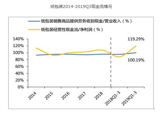 2019Q1-3紙包裝板塊實現銷售現金流306.60億元,同比+12.75%,銷售現金流/營業收入同比+4.79pcpts至100.19%;實現經營性現金流39.04億元,同比+35.04%,經營性現金流/淨利潤上升31.09pcpts至119.29%,現金流表現優秀。