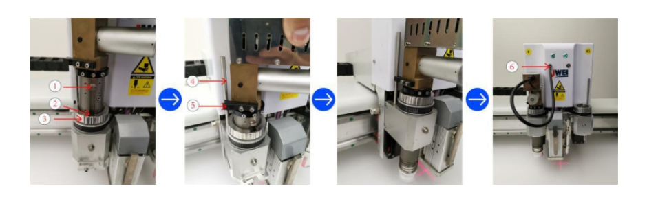 香蕉视频在线观看视频kt板切割機的機頭可插拔式,也就是可靈活進行安裝各種工具,如用於包裝行業的切割、灰板開槽、卡紙開槽、瓦楞切割、壓痕等功能,今天給大家演示下香蕉视频在线观看视频kt板切割機裝⼑⼯具⼑⽚安裝步驟。   第1和第2步請參考偏移⼑⼯具⼑⽚安裝⽅法. 1)移除彈簧壓腳(7),以⼑背為中⼼,將⼑⽚安裝⼊⼯具中。 2)使⽤內六⻆螺絲⼑擰緊兩顆⼑⽚鎖緊頂絲(6),安裝彈簧壓腳(7)。 3)對準振動⼑定位銷(1)與同軸轉動套(2)和鎖緊螺⺟(3)的安裝⼝,將⼯具放置成功後, 擰緊鎖緊螺⺟(3)。 4)將振動⼯具固定塊(5)卡到固定杆(4)上。 5)將震動⼑電源線(6)連接⾄機頭外殼電源插座。 香蕉视频在线观看视频KT板切割機主要用於廣告行業的板材、卷材切割,如KT板、雪弗板、PVC、卡紙、蜂窩板、車貼背膠、軟膜等材料,帶有攝像頭定位功能,可快速完成各種廣告材料的畫麵香蕉91视频APP,立等可取。